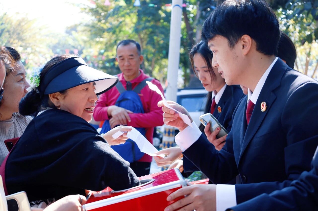 在热闹的节日现场,党员干警们化身“法治宣传员”,通过发放宣传图册、设置法律问题有奖问答等形式,与基诺族群众亲切互动。从《中华人民共和国民法典》中与群众生产生活密切相关的条款,到防范电信网络诈骗的实用技巧,党员干警们用通俗易懂的语言,把法律知识送到群众身边。答对问题的群众还能获得检察文创产品,现场欢声笑语不断,法治宣传也在轻松的氛围中入脑入心。