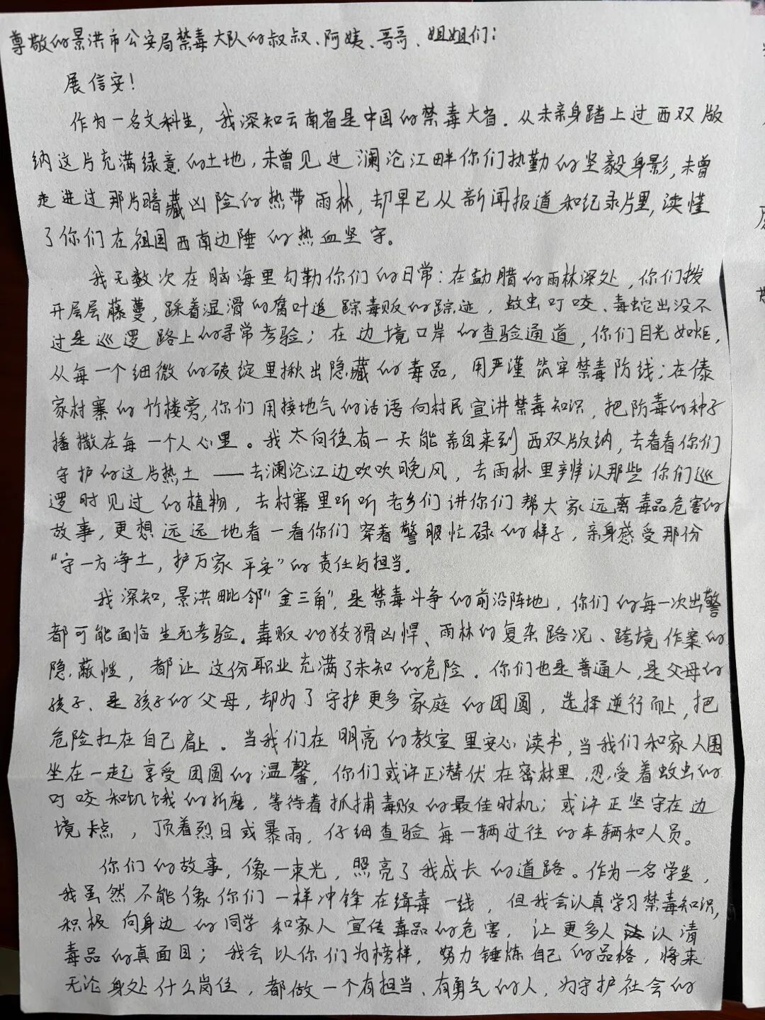 从西南边陲的无畏坚守,到千里之外的青春致敬;从禁毒民警的以身许国,到青年学子的深情共鸣。这一封跨越山河的信件,不仅架起了一座警民同心的桥梁,更点燃了全民禁毒的青春火炬。