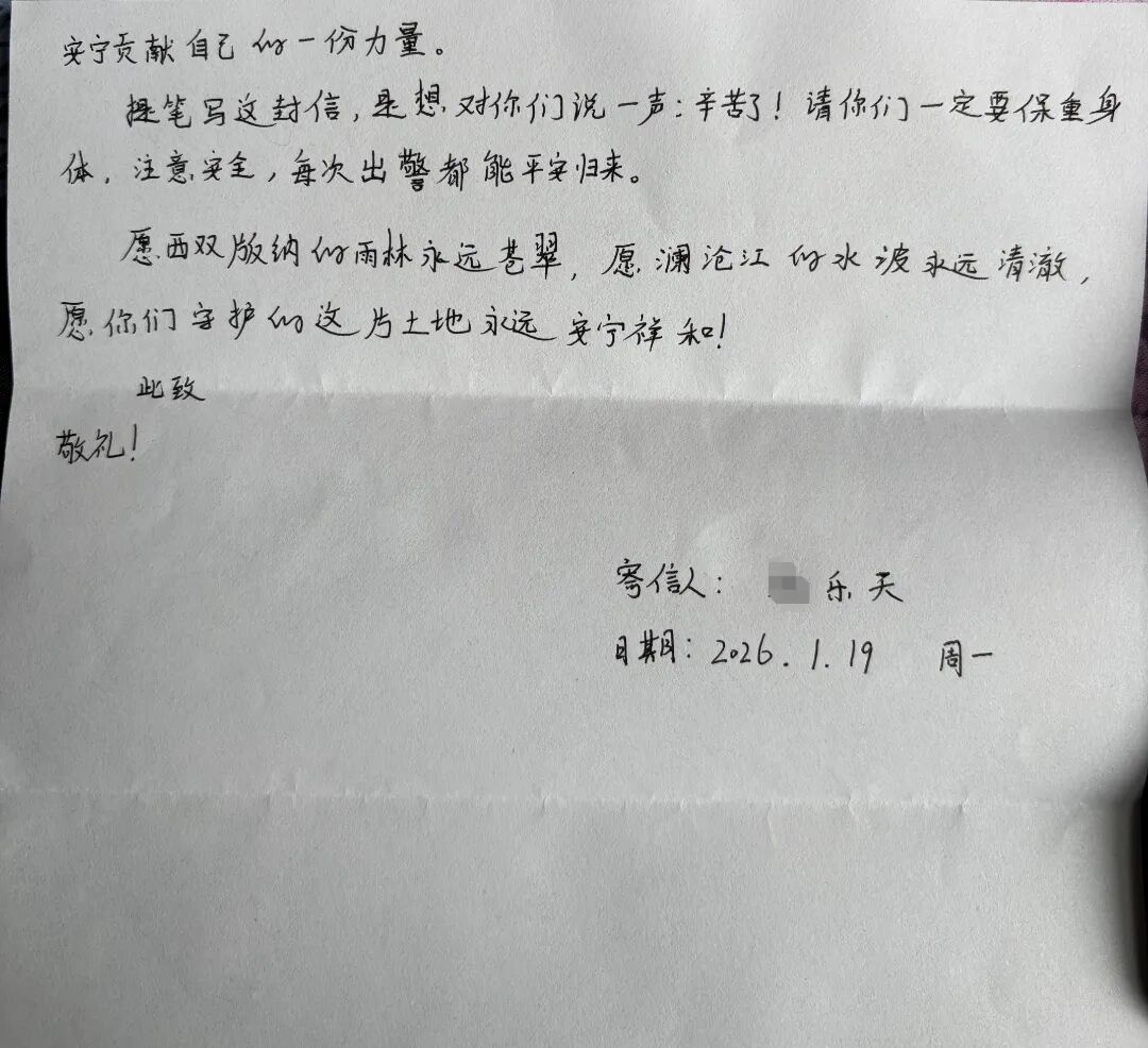 “从未亲身踏上西双版纳,却早已从新闻报道和纪录片里,读懂了你们在祖国西南边陲的热血坚守……”近日,景洪市公安局禁毒大队收到一封跨越千里、来自河北省邢台市的来信。信中字句滚烫、情意真挚,让每一位奋战在一线的禁毒民警,心中涌起阵阵暖流。