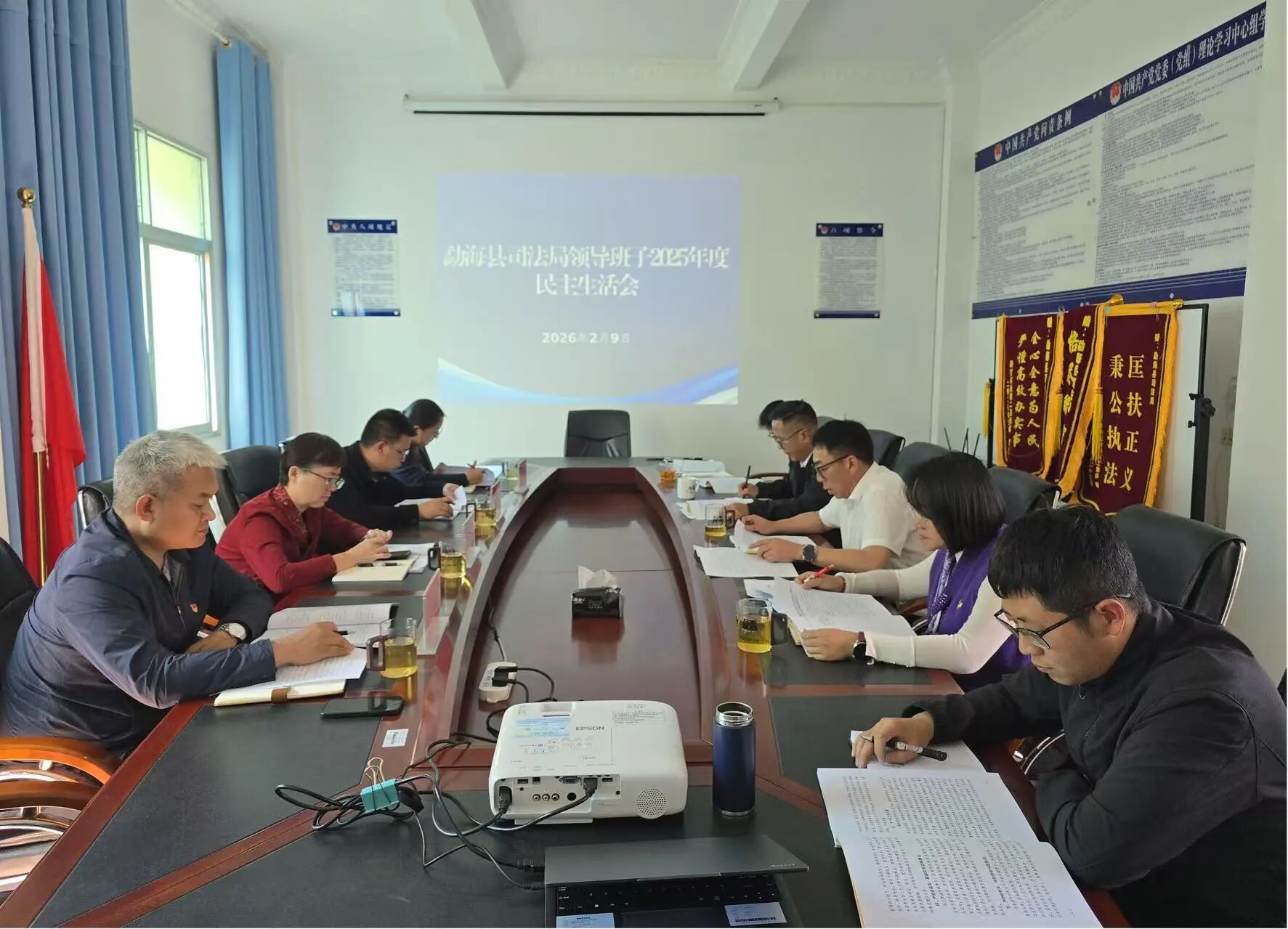 2月9日下午,勐海县司法局领导班子召开2025年度民主生活会。县委第四督导组组长、县委组织部副部长航天同志、县委组织部四级主任科员伍燕同志到会指导,西双版纳州司法局党委委员、政治部主任彭淞同志,县委政法委副书记田彪同志列席会议,党组书记、局长李晓聪同志主持会议,全体班子成员参加会议。