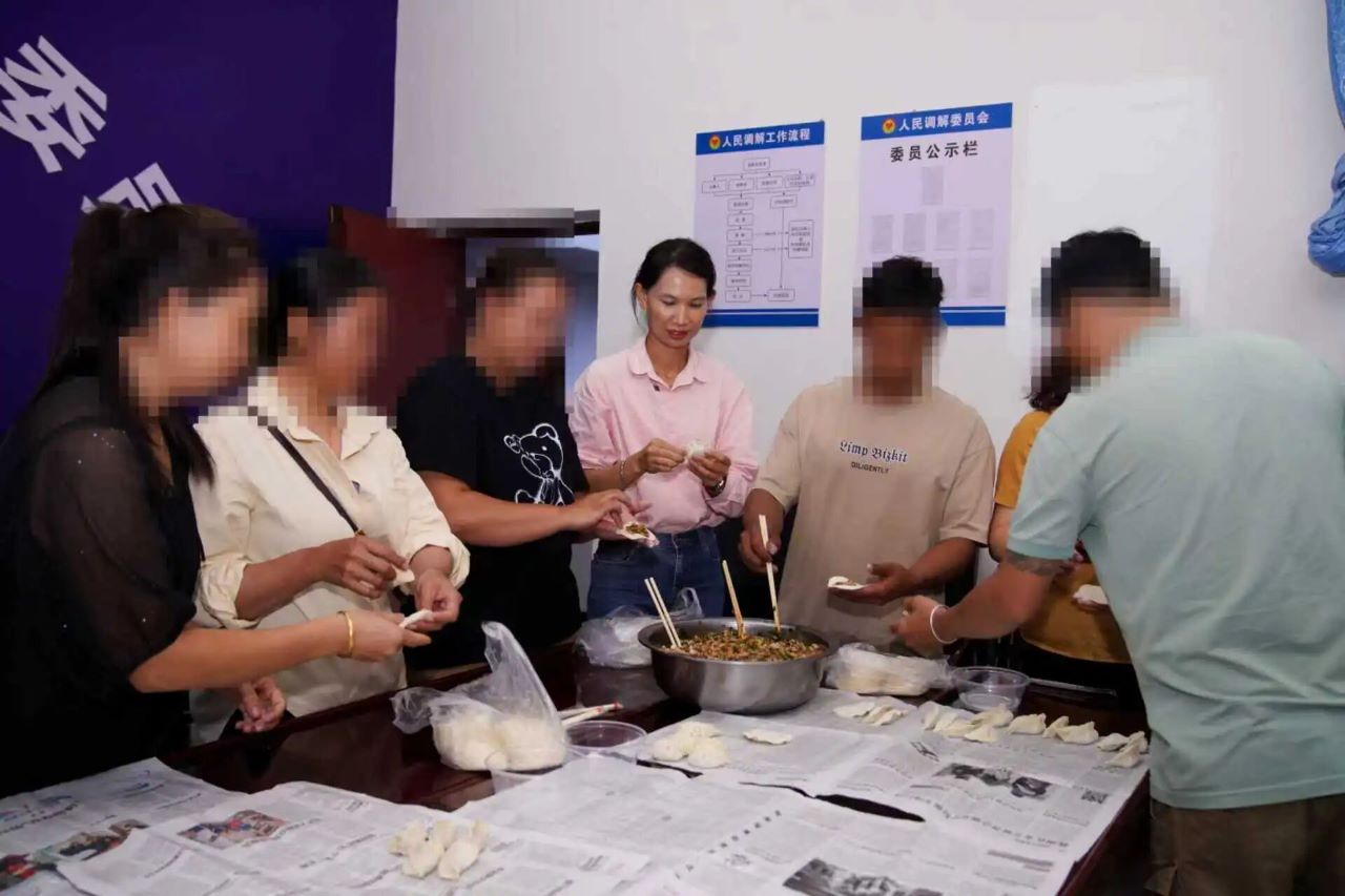 (图为:姜雨寒组织社区矫正对象包饺子)