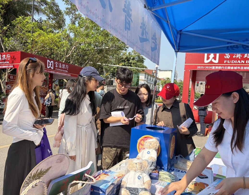 活动现场热闹非凡,独具法治特色的“滇超”联赛主题打卡点与非遗普法摊位,巧妙将法治宣传与傣族非遗文化元素融入其中,成为赛场外一道亮丽的法治风景线,不少球迷、游客纷纷驻足拍照打卡,在轻松愉悦的氛围中近距离感受法治文化魅力。勐腊县司法局还设立普法“盲盒”互动环节,群众现场抽题作答并扫码关注“勐腊县普法”微信公众号和视频号即可赢得普法小熊、法治冰箱贴、法治抽纸、法治围裙等实用小礼品,大家踊跃参与,在寓教于乐中学习法律知识。摊位上,傣纸手工制作的法治伞、法治傣扇、法治礼盒等非遗文创产品整齐陈列、格外吸睛,将傣族传统技艺与法治理念深度融合,既彰显非遗韵味,又传递法治精神,深受现场群众欢迎。