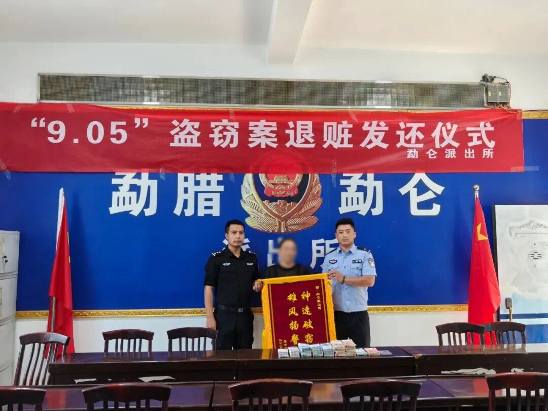 近日,勐腊县公安局勐仑派出所举行退赃发还仪式,向群众集中返还被盗现金4万余元、50余件贵重首饰,总价值超10万元。高效破案与追赃成果,赢得群众高度赞誉。接到群众报警后,勐仑派出所联合刑侦大队开展调查走访,仅用12小时便锁定并抓获犯罪嫌疑人,破获案件并追回全部被盗财物,及时为群众挽损,有力震慑辖区违法犯罪。仪式现场,受害群众领回失物时激动不已,紧握民警双手致谢:“破案神速还追赃,真是太感谢你们了!”并特意制作“神速破窃案,雄风扬警威”锦旗赠予派出所。
