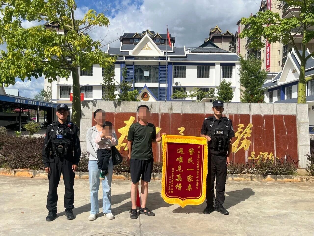 近日,勐海县公安局勐海派出所民警接到群众报警,称在某商场门口有一名两岁男童独自哭闹。抵达现场后,民警先将男童抱至安全区域,用零食和牛奶安抚其情绪。随后,民警立即走访周边商铺、询问过往行人。最终通过小区物业联系到家长。当天下午,孩子家长特意定制了一面印有“警民一家亲,遇难见真情”的锦旗送到民警手中,表达感激之情。